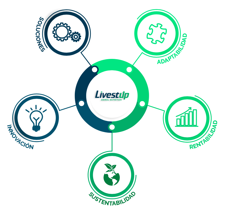 Buscar, desarrollar y aportar soluciones, es nuestro quehacer diario y una gran motivación para LivestUp. Por ello, ponemos al servicio de nuestros clientes, cada acción, minuto y conocimiento y así ser parte de las innovaciones que caminan y crecen de la mano de los productores pecuarios para desarrollar y obtener productos de origen animal de la más alta calidad, con un bajo impacto ambiental y el mejor trato animal y humano, conviviendo armoniosamente como humanidad y nuestro planeta.